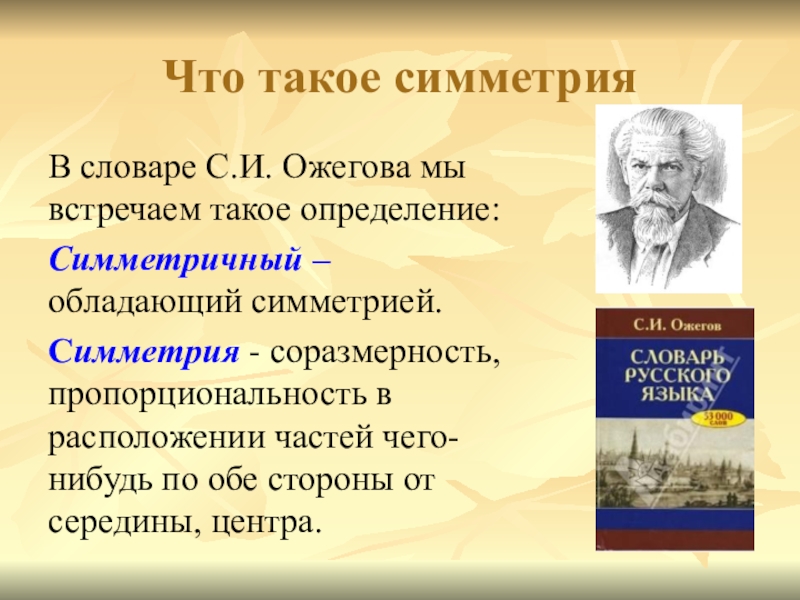 Что такое симметрияВ словаре С.И. Ожегова мы встречаем такое определение: Симметричный – обладающий симметрией.Симметрия - соразмерность, пропорциональность
