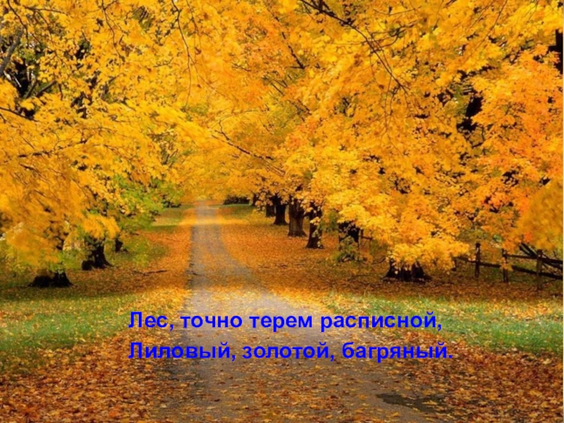 Лес, точно терем расписной,Лиловый, золотой, багряный.