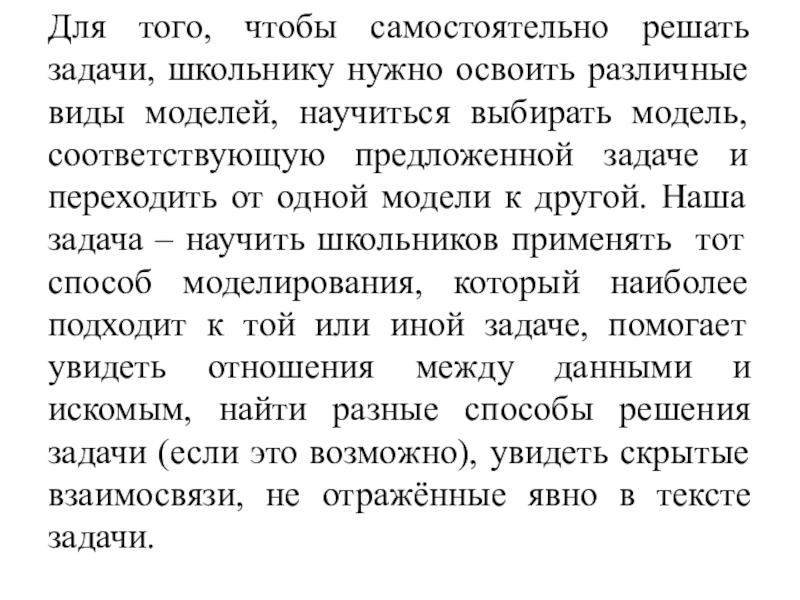 моделей, научиться выбирать модель, соответствующую предложенной задаче и переходить от одной модели к другой. Наша задача – научить школьников применять тот способ моделирования, который наиболее подходит к той или иной задаче, помогает увидеть отношения между данными и искомым, найти разные способы решения задачи (если это возможно), увидеть скрытые взаимосвязи, не отражённые явно в тексте задачи.