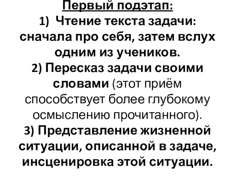 1) Чтение текста задачи: сначала про себя, затем вслух одним