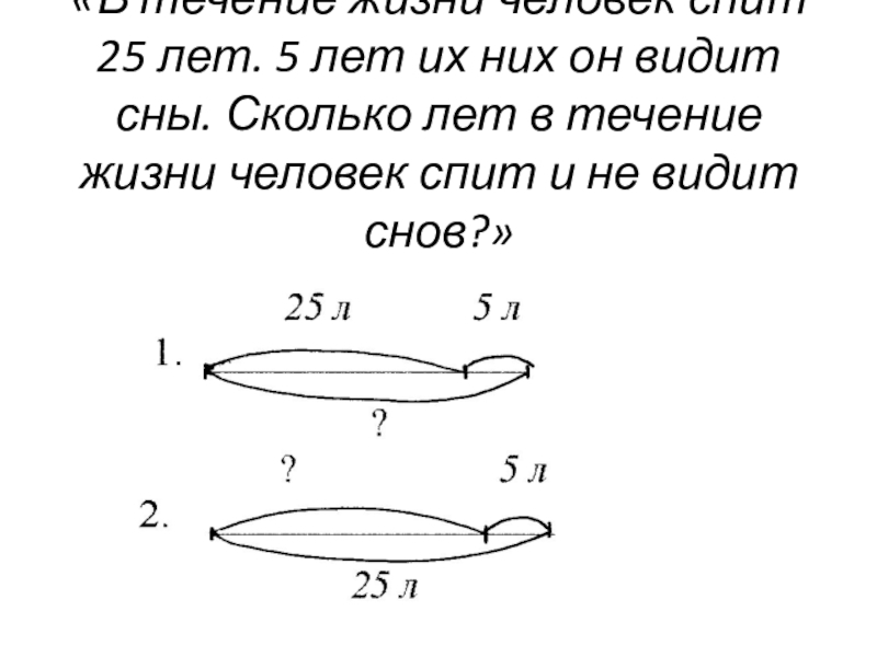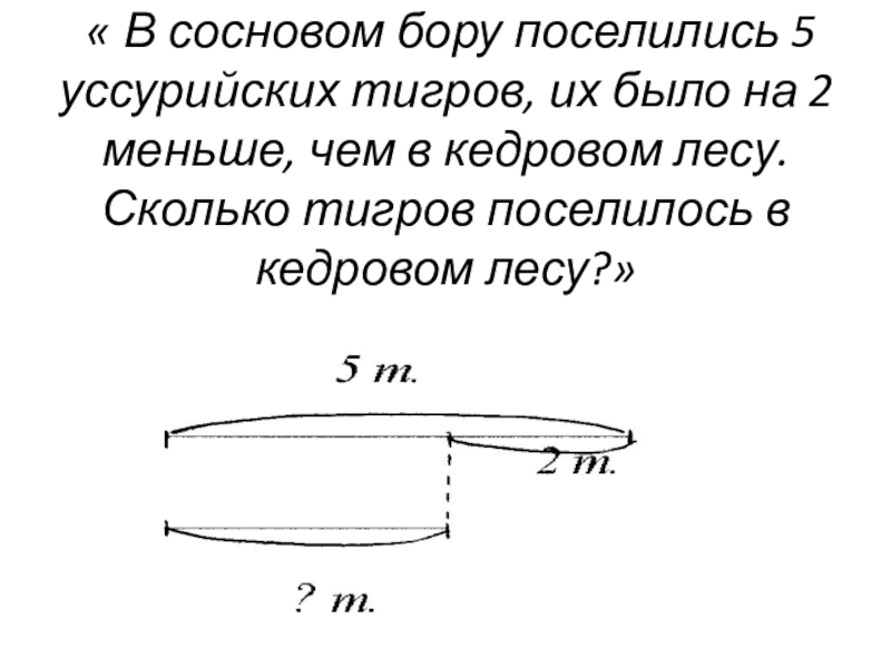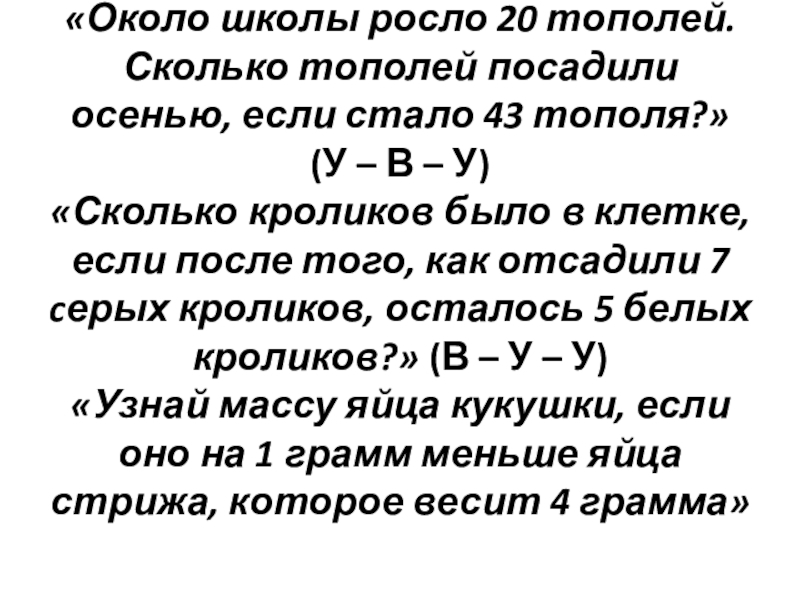 «Сколько кроликов было в клетке, если после того, как отсадили 7 cерых кроликов, осталось 5 белых кроликов?» (В – У – У)