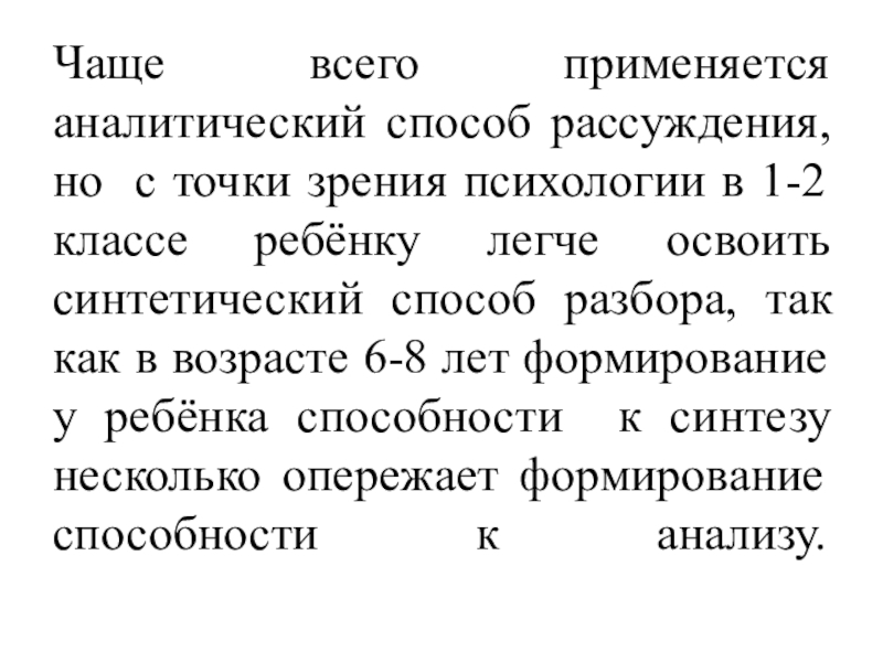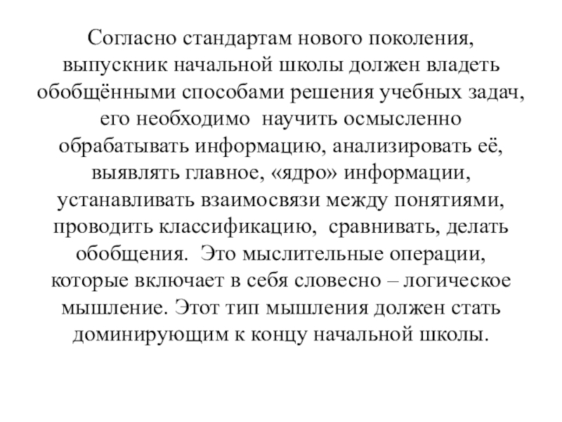 решения учебных задач, его необходимо научить осмысленно обрабатывать информацию, анализировать её, выявлять главное, «ядро» информации, устанавливать взаимосвязи между понятиями, проводить классификацию, сравнивать, делать обобщения. Это мыслительные операции, которые включает в себя словесно – логическое мышление. Этот тип мышления должен стать доминирующим к концу начальной школы.