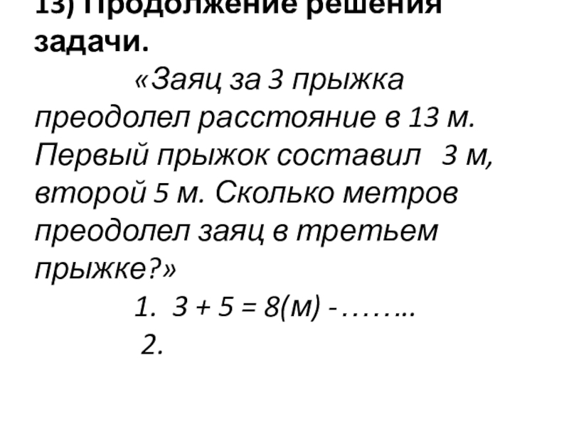 «Заяц за 3 прыжка преодолел расстояние в 13 м. Первый прыжок составил 3 м, второй 5 м. Сколько метров преодолел заяц в третьем прыжке?»