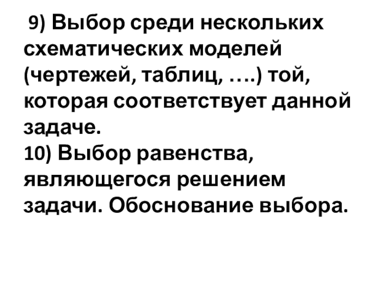 Слайд 85 9) Выбор среди нескольких схематических моделей (чертежей, таблиц, ….) той,