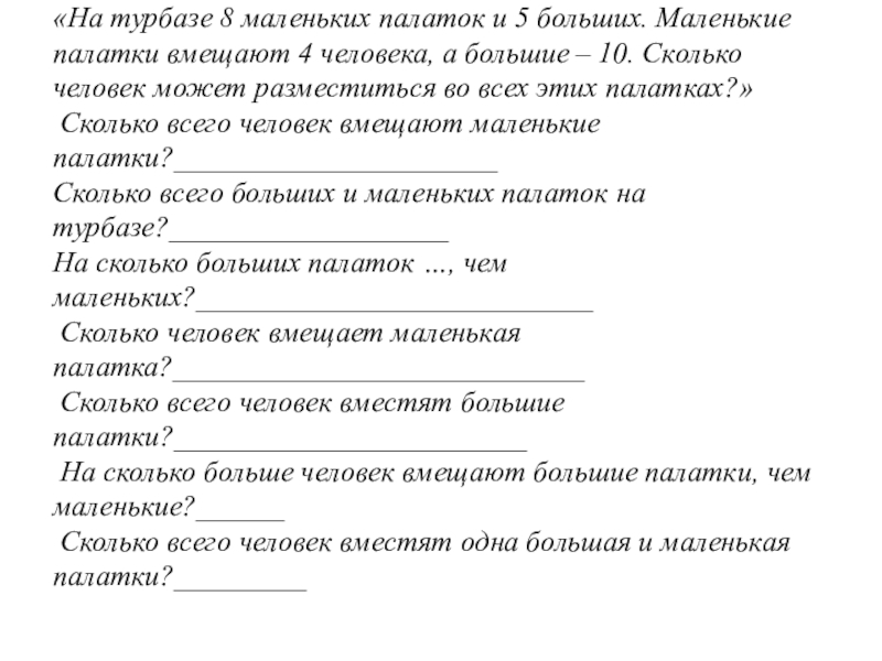 Слайд 90«На турбазе 8 маленьких палаток и 5 больших. Маленькие палатки вмещают