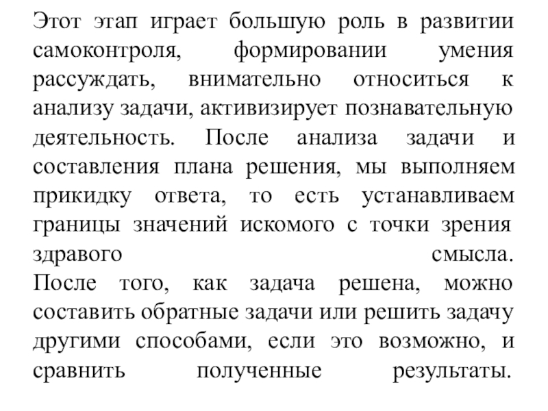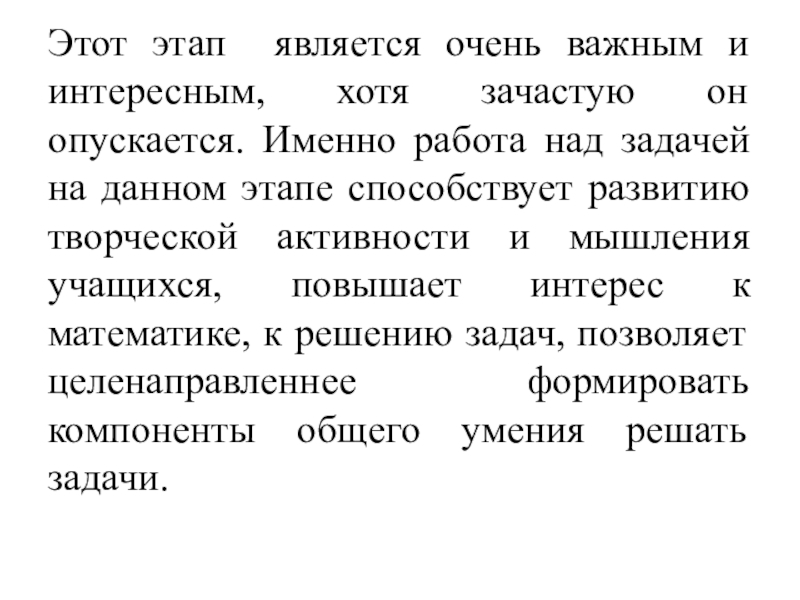Именно работа над задачей на данном этапе способствует развитию творческой активности и мышления учащихся, повышает интерес к математике, к решению задач, позволяет целенаправленнее формировать компоненты общего умения решать задачи.