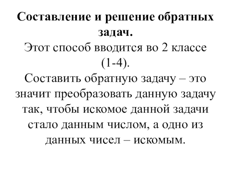Важно как можно чаще использовать тексты нетипичных конструкций: текст задачи состоит из одного сложного вопросительного или повествовательного предложения, в котором стоит сначала вопрос, потом условие; часть условия представлена в начале текста, потом следует вопрос и другая часть условия; вместо слова «сколько» в вопросе используются слова «найди», «узнай» и т. д.).