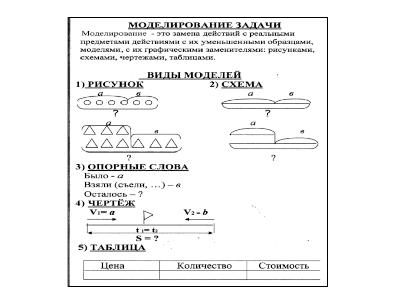образцами, моделями, с их графическими заменителями: рисунками, схемами, чертежами, таблицами. Модель должна помочь ученику понять содержание задачи, выявить отношения между данными и искомым, найти разные способы решения задачи, увидеть новые,