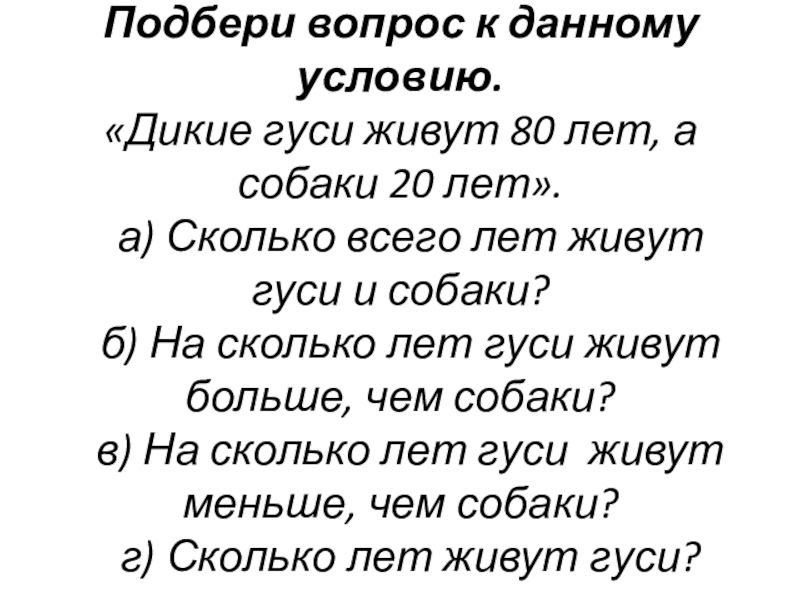 в) На сколько лет гуси живут меньше, чем собаки?