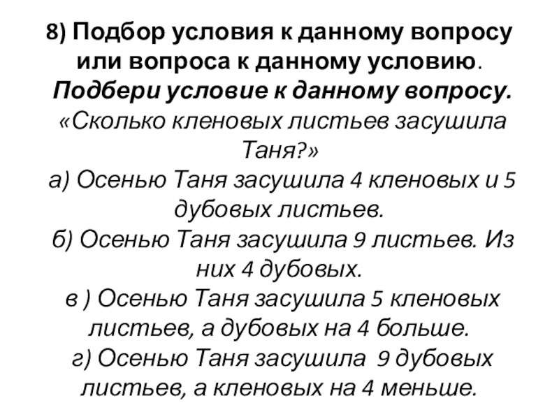 8) Подбор условия к данному вопросу или вопроса к данному условию.
