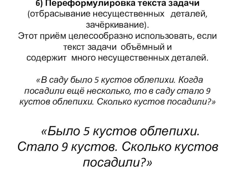 6) Переформулировка текста задачи (отбрасывание несущественных деталей, зачёркивание).