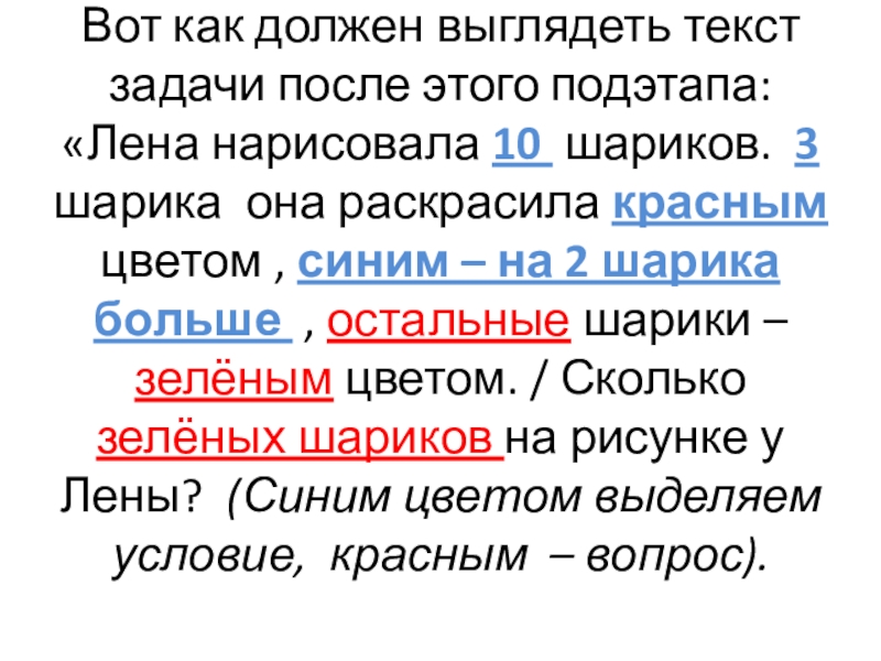 шариков. 3 шарика она раскрасила красным цветом , синим – на 2 шарика больше , остальные шарики – зелёным цветом. / Сколько зелёных шариков на рисунке у Лены? (Синим цветом выделяем условие, красным – вопрос).