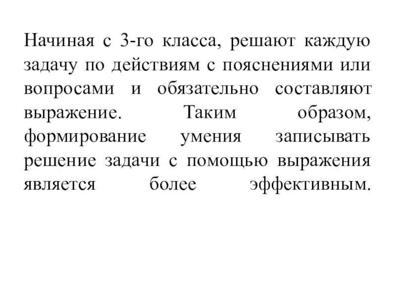 работы над задачей в силу трудоёмкости и ограниченности во времени в рамках 40-минутного урока. Во главу угла ставится количество решённых задач, а не качество работы, что влечёт за собой поверхностное отношение к текстам задач, действия по образцу, неумение выполнять задания с нестандартными формулировками.