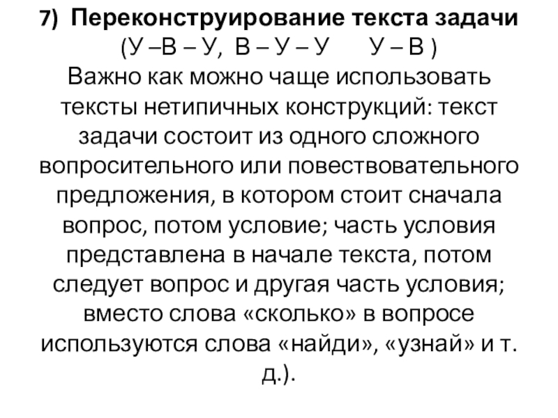 Слайд 137) Переконструирование текста задачи (У –В – У, В – У