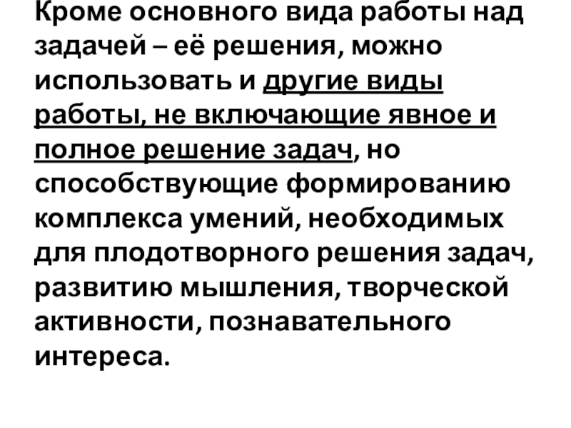и другие виды работы, не включающие явное и полное решение задач, но способствующие формированию комплекса умений, необходимых для плодотворного решения задач, развитию мышления, творческой активности, познавательного интереса.
