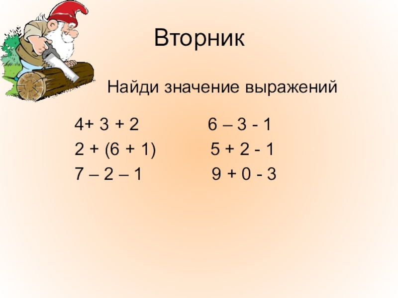 ВторникНайди значение выражений  4+ 3 + 2       6 – 3