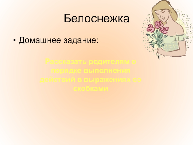 БелоснежкаДомашнее задание:Рассказать родителям о порядке выполнения действий в выражениях со скобками