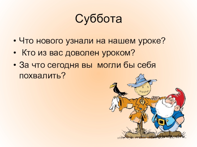 СубботаЧто нового узнали на нашем уроке? Кто из вас доволен уроком?За что сегодня вы могли бы себя