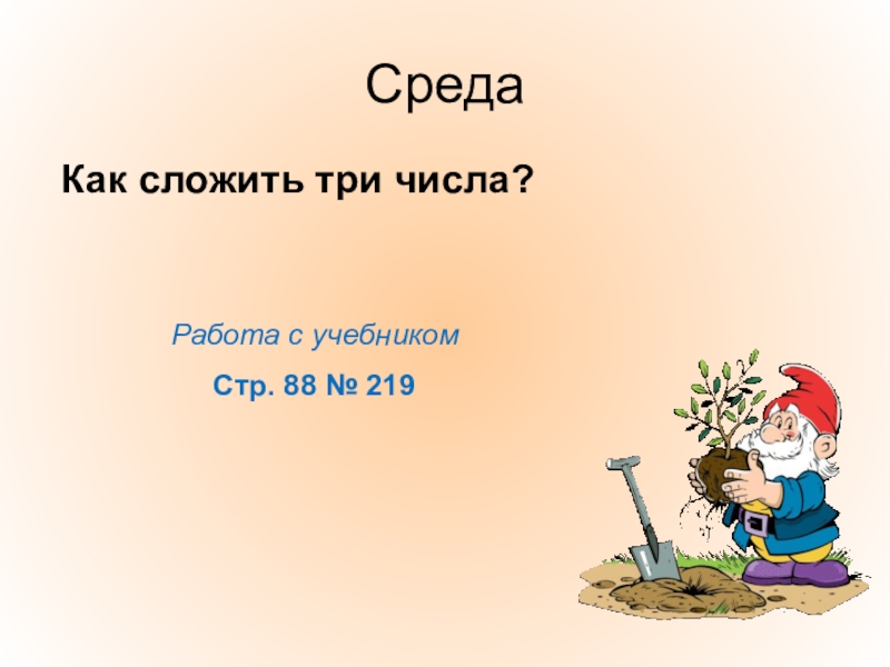 СредаРабота с учебникомСтр. 88 № 219Как сложить три числа?