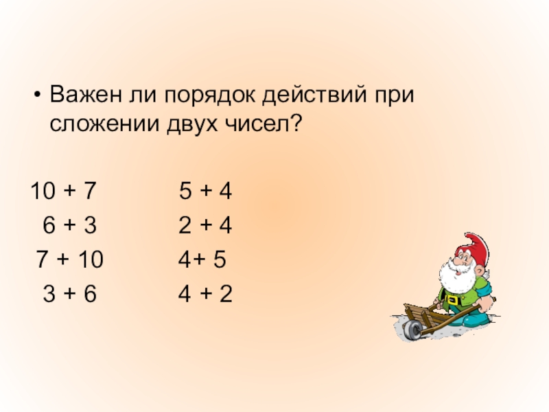 Важен ли порядок действий при сложении двух чисел?10 + 7      5 +