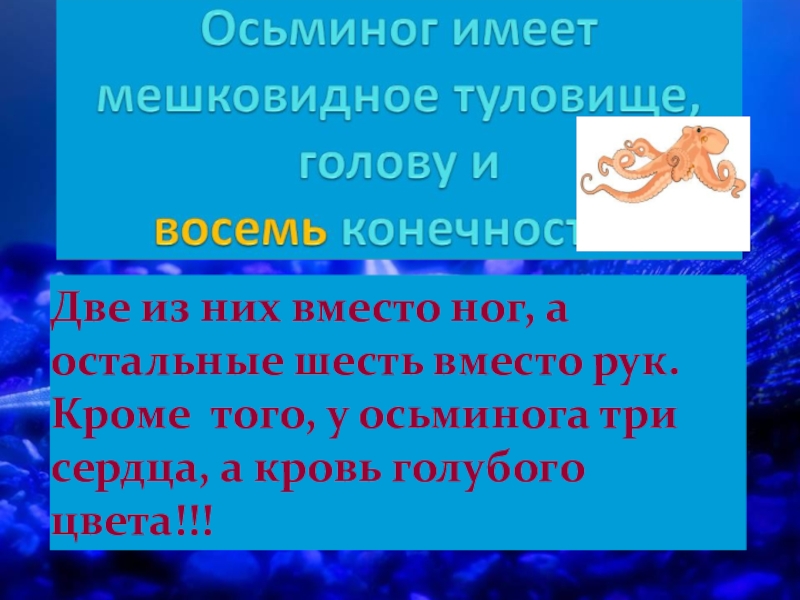 Две из них вместо ног, а остальные шесть вместо рук. Кроме того, у осьминога три сердца, а