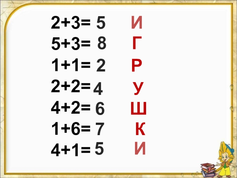 2+3=5+3=1+1=2+2=4+2=1+6=4+1=5   И8   Г2   Р4   У6   Ш7