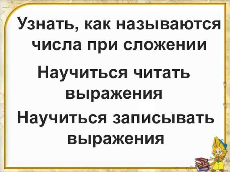 Узнать, как называются числа при сложенииНаучиться читать выраженияНаучиться записывать выражения