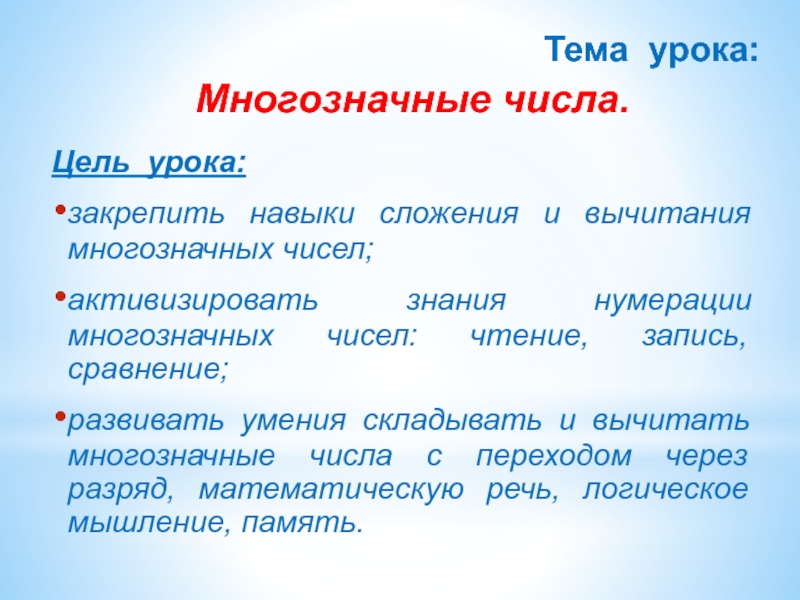 развивать умения складывать и вычитать многозначные числа с переходом через разряд, математическую речь, логическое мышление, память.