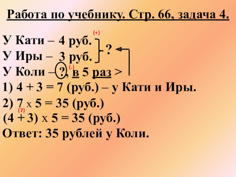 1) 4 + 3 = 7 (руб.) – у Кати и Иры.