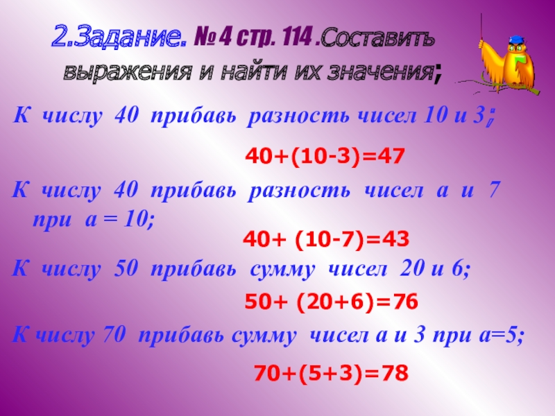 К числу 40 прибавь разность чисел а и 7 при а = 10;