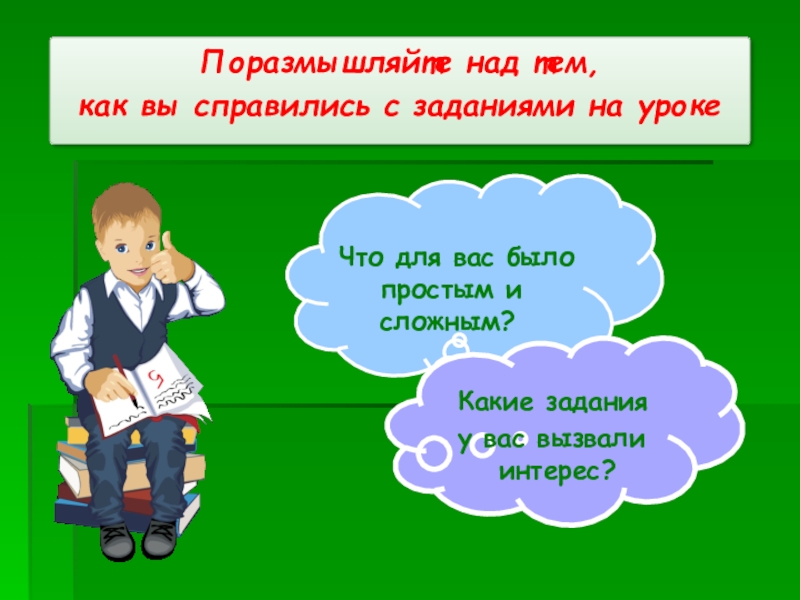 Поразмышляйте над тем, как вы справились с заданиями на урокеЧто для вас было простым и сложным? Какие