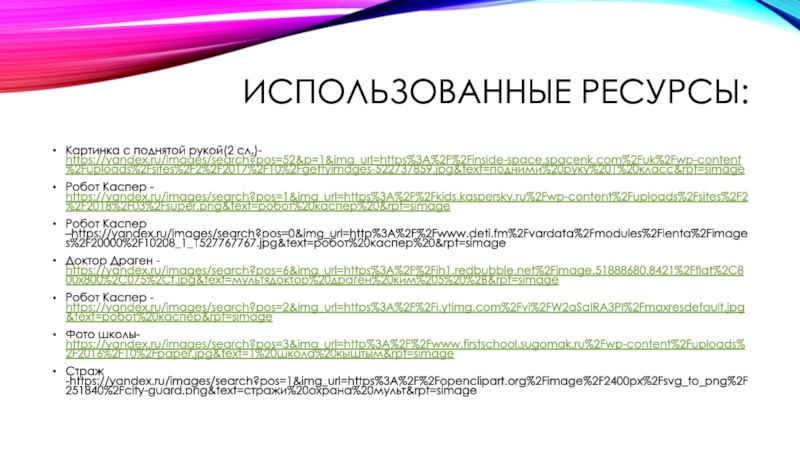 Использованные ресурсы:Картинка с поднятой рукой(2 сл.)- https://yandex.ru/images/search?pos=52&p=1&img_url=https%3A%2F%2Finside-space.spacenk.com%2Fuk%2Fwp-content%2Fuploads%2Fsites%2F2%2F2017%2F10%2Fgettyimages-522737859.jpg&text=подними%20руку%201%20класс&rpt=simageРобот Каспер - https://yandex.ru/images/search?pos=1&img_url=https%3A%2F%2Fkids.kaspersky.ru%2Fwp-content%2Fuploads%2Fsites%2F2%2F2018%2F03%2Fsuper.png&text=робот%20каспер%20&rpt=simageРобот Каспер –https://yandex.ru/images/search?pos=0&img_url=http%3A%2F%2Fwww.deti.fm%2Fvardata%2Fmodules%2Flenta%2Fimages%2F20000%2F10208_1_1527767767.jpg&text=робот%20каспер%20&rpt=simageДоктор Драген - https://yandex.ru/images/search?pos=6&img_url=https%3A%2F%2Fih1.redbubble.net%2Fimage.51888680.8421%2Fflat%2C800x800%2C075%2Cf.jpg&text=мультядоктор%20драген%20ким%205%20%2B&rpt=simageРобот Каспер -
