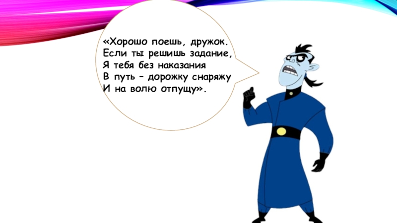 «Хорошо поешь, дружок.Если ты решишь задание,Я тебя без наказанияВ путь – дорожку снаряжуИ на волю отпущу».