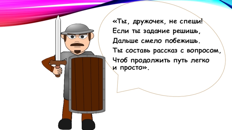 «Ты, дружочек, не спеши!Если ты задание решишь,Дальше смело побежишь.Ты составь рассказ с вопросом,Чтоб продолжить путь легко