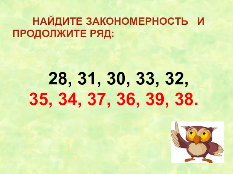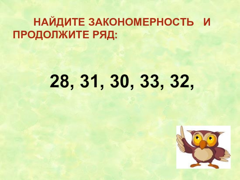 НАЙДИТЕ ЗАКОНОМЕРНОСТЬ  И ПРОДОЛЖИТЕ РЯД: 28, 31, 30, 33, 32,