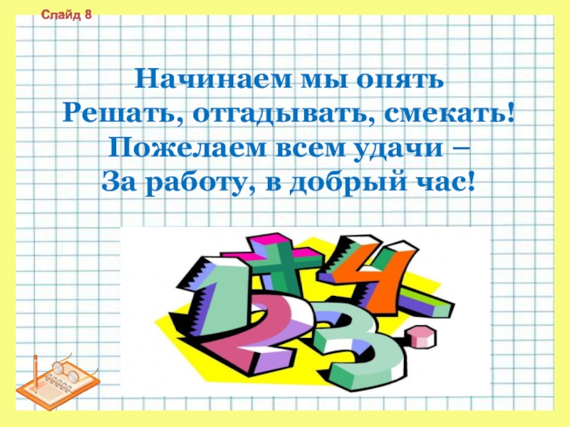 Начинаем мы опятьРешать, отгадывать, смекать!Пожелаем всем удачи – За работу, в добрый час!Слайд 8Слайд 8Слайд 8Слайд 8