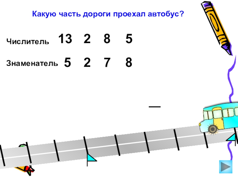 Какую часть дороги проехал автобус? Числитель 51382Знаменатель5278
