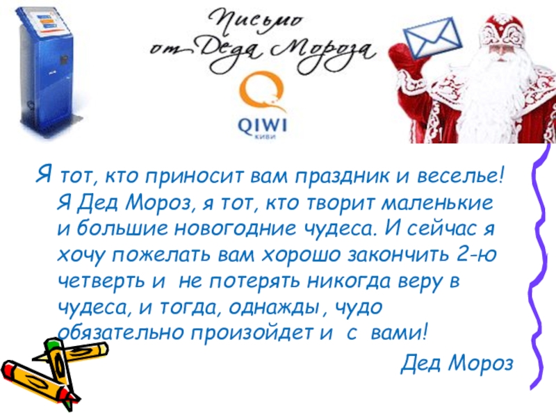 я тот, кто творит маленькие и большие новогодние чудеса. И сейчас я хочу пожелать вам хорошо закончить 2-ю четверть и не потерять никогда веру в чудеса, и тогда, однажды, чудо обязательно произойдет и с вами!