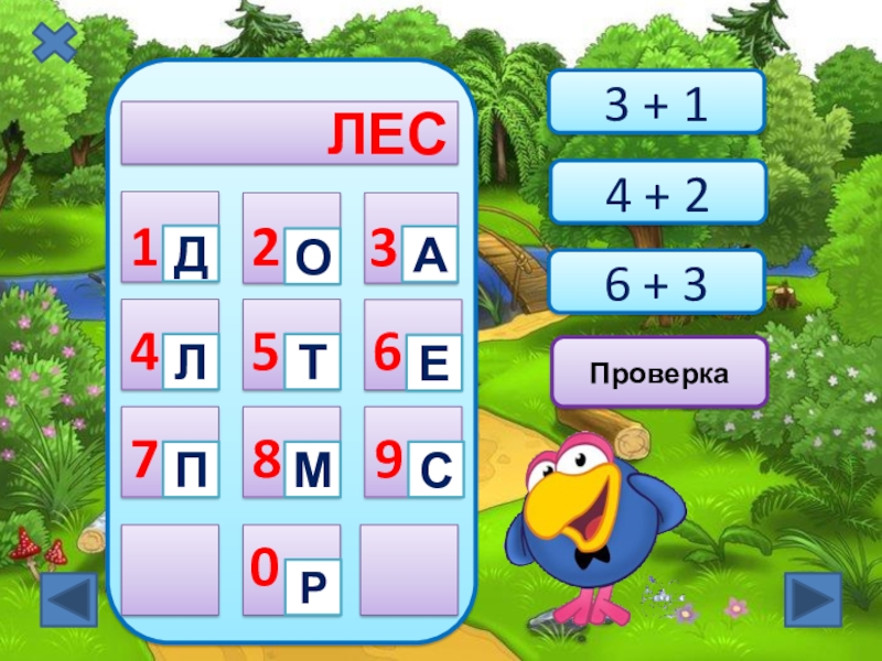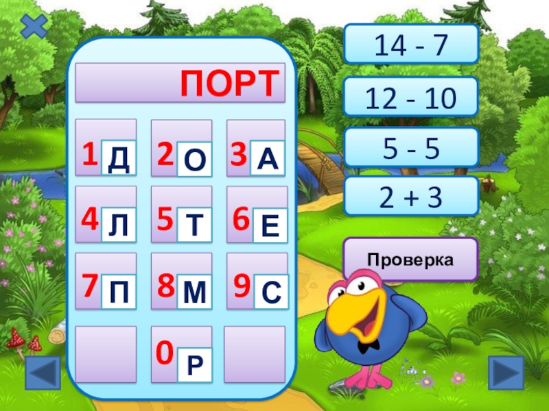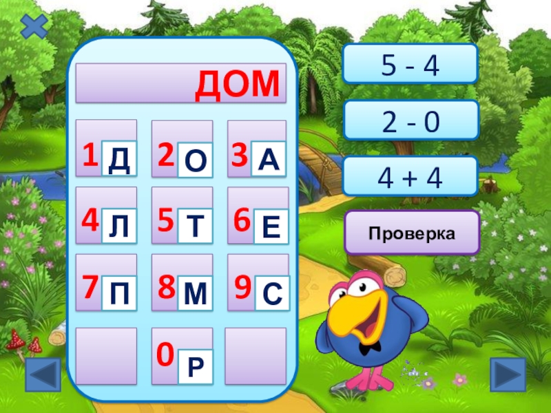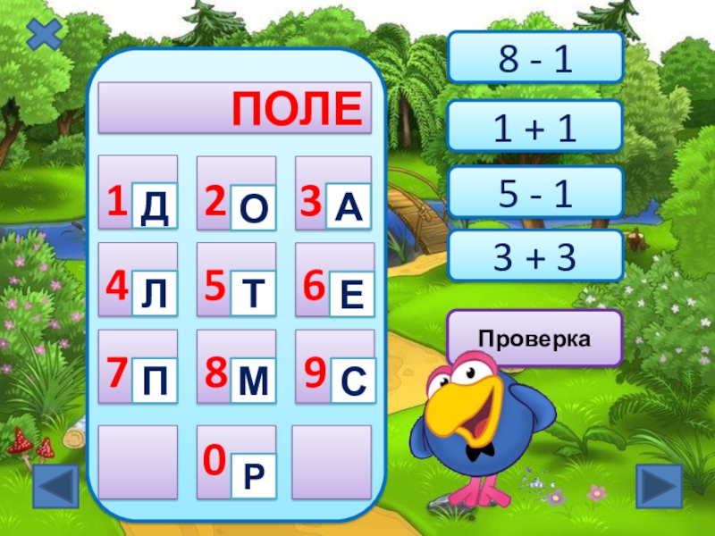ДОАТЛМПЕСРПОЛЕ1234567890ТЛМПЕСРДЕЛО123456789010 - 95 + 113 - 9Проверка9 - 7ДОА