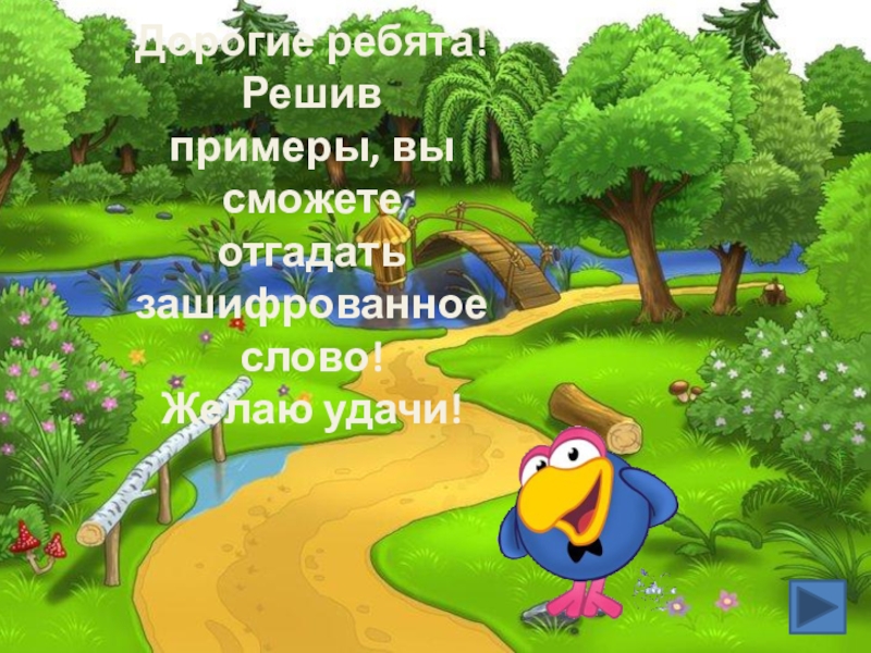 Дорогие ребята!Решив примеры, вы сможете отгадать зашифрованное слово!Желаю удачи!