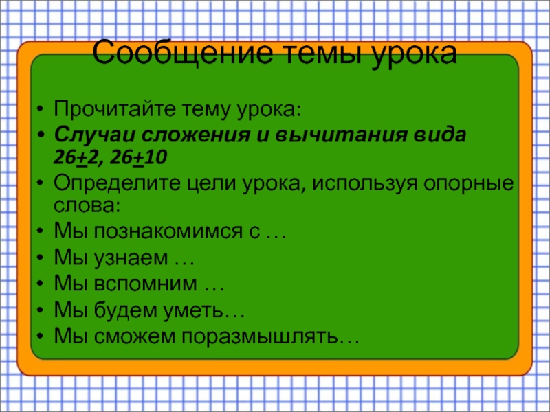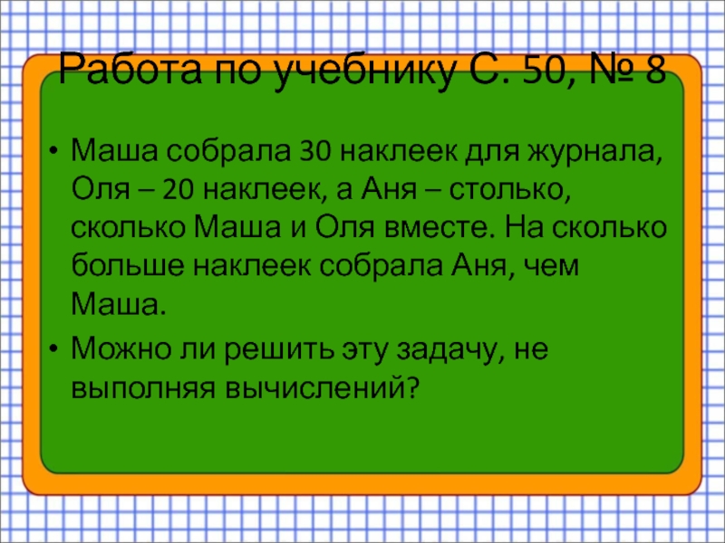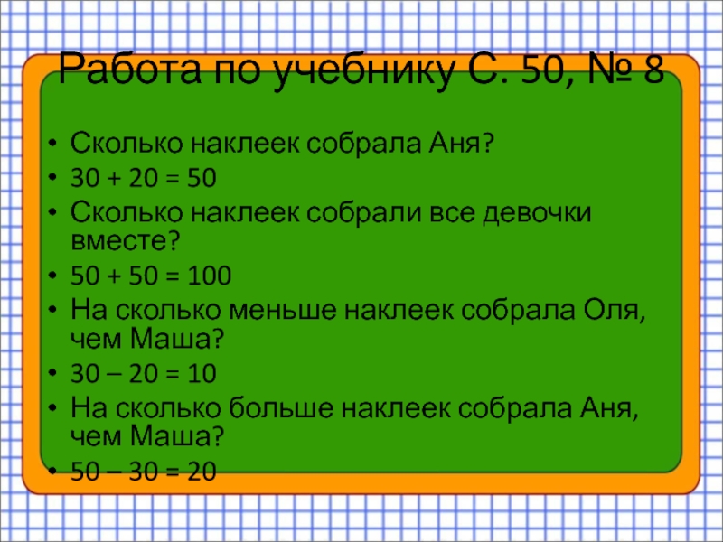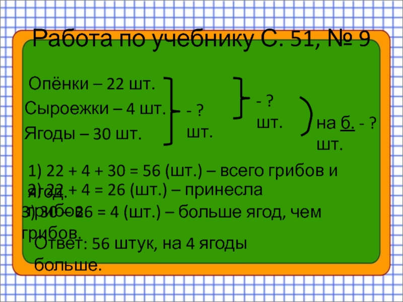 2) 22 + 4 = 26 (шт.) – принесла грибов.