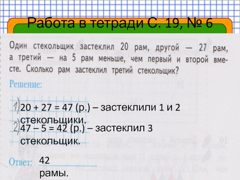 47 – 5 = 42 (р.) – застеклил 3 стекольщик.