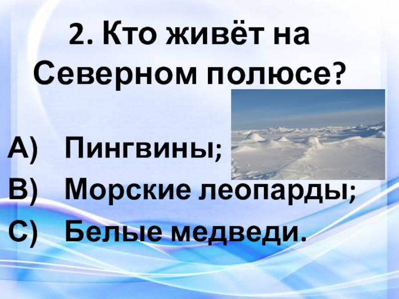 2. Кто живёт на Северном полюсе?Пингвины;Морские леопарды;Белые медведи.