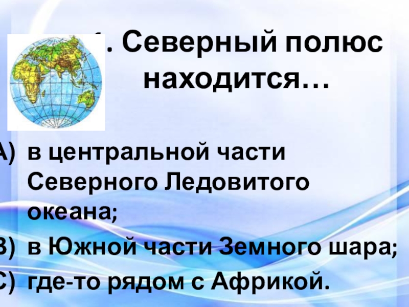 1. Северный полюс находится…в центральной части Северного Ледовитого океана;в Южной части Земного шара;где-то рядом с Африкой.