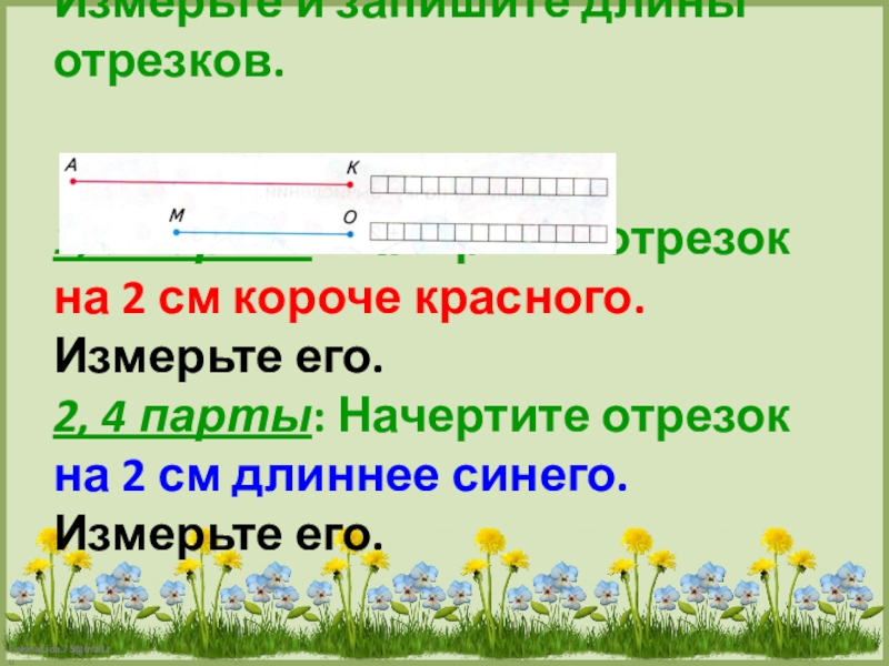 см короче красного. Измерьте его. 2, 4 парты: Начертите отрезок на 2 см длиннее синего. Измерьте его.