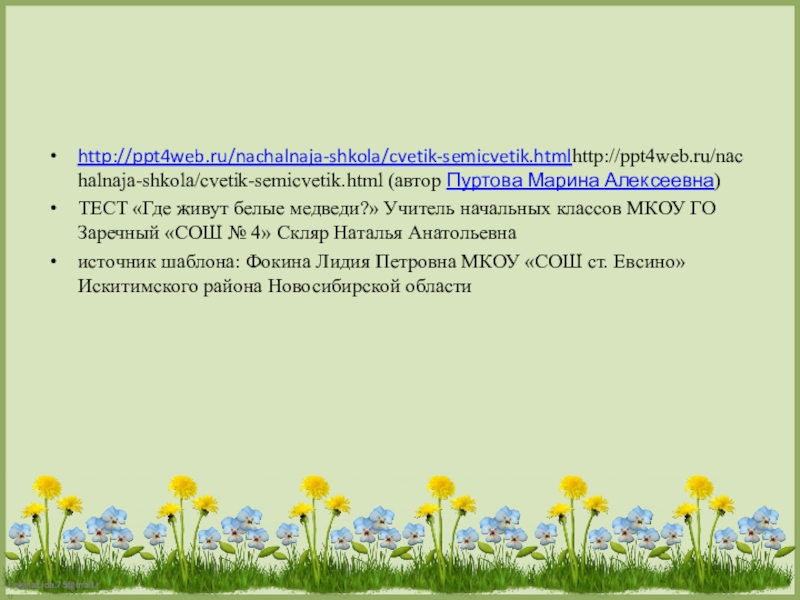 http://ppt4web.ru/nachalnaja-shkola/cvetik-semicvetik.htmlhttp://ppt4web.ru/nachalnaja-shkola/cvetik-semicvetik.html (автор Пуртова Марина Алексеевна)ТЕСТ «Где живут белые медведи?» Учитель начальных классов МКОУ ГО Заречный «СОШ №