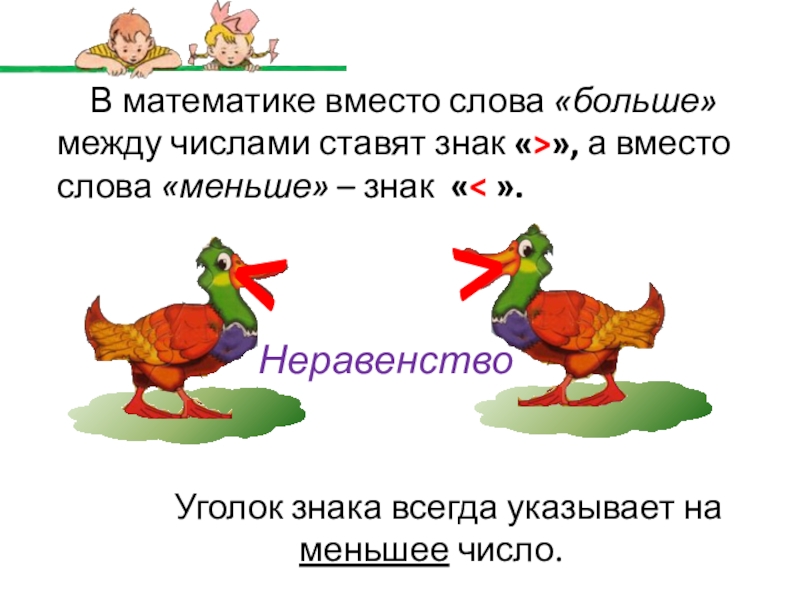 Неравенство    В математике вместо слова «больше» между числами ставят знак «>», а вместо слова