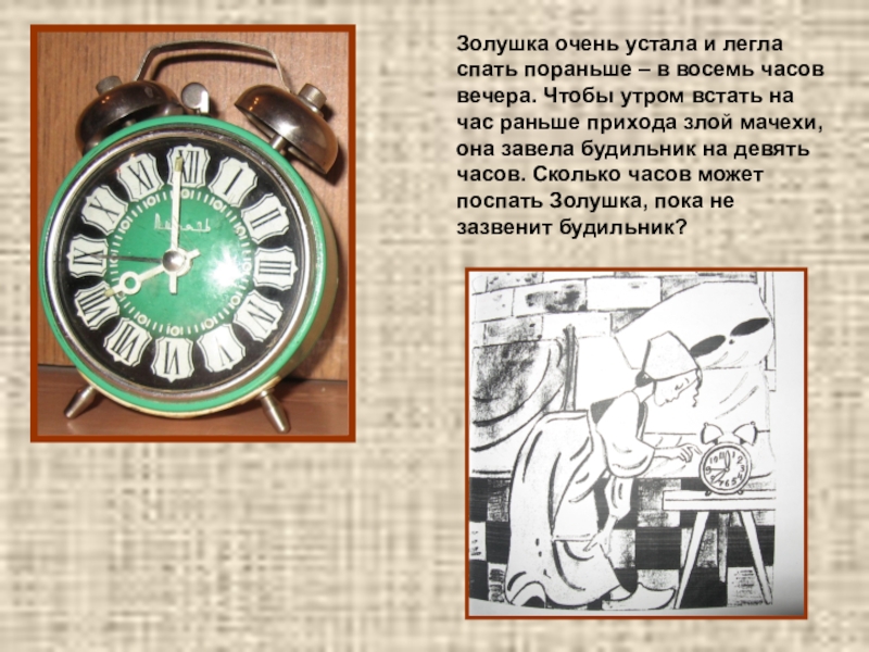 вечера. Чтобы утром встать на час раньше прихода злой мачехи, она завела будильник на девять часов. Сколько часов может поспать Золушка, пока не зазвенит будильник?