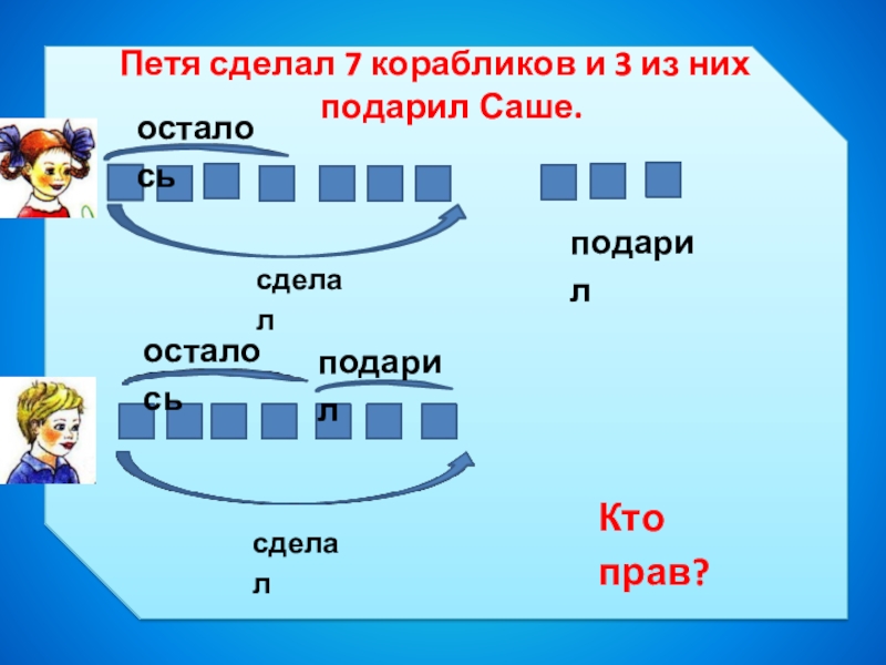 Петя сделал 7 корабликов и 3 из них подарил Саше. сделалподарилсделалподарилосталосьосталосьКто прав?