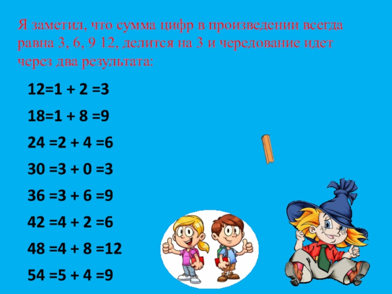 Я заметил, что сумма цифр в произведении всегда равна 3, 6, 9 12, делится на 3 и чередование идет через два результата:
